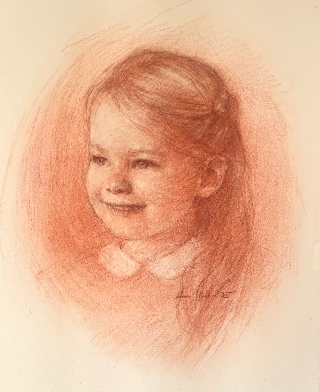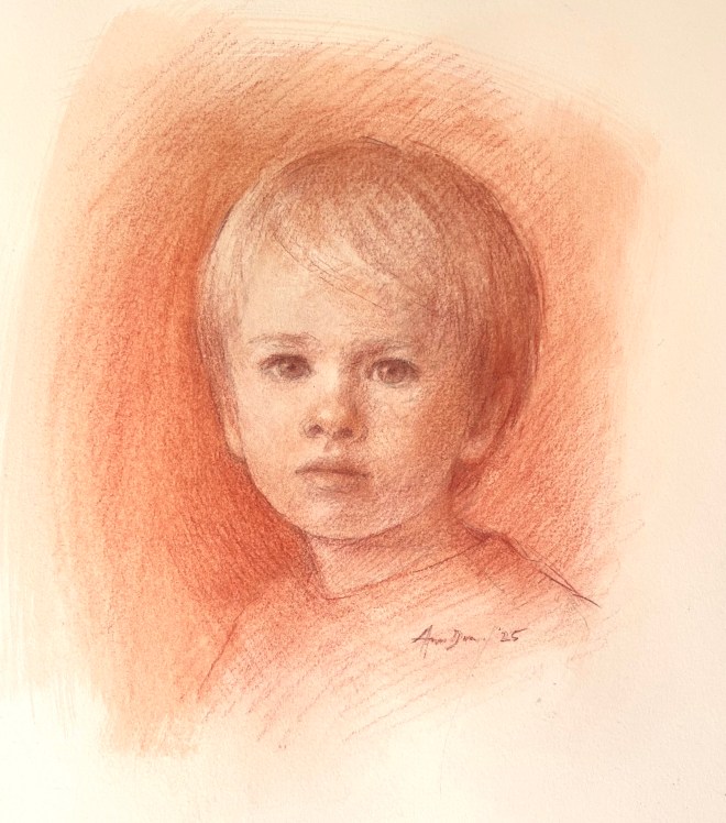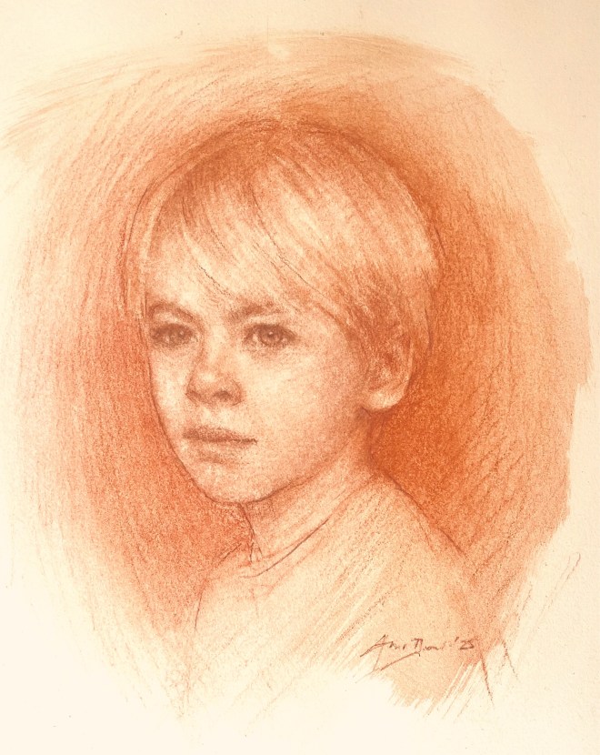 These are four sanguine portraits on heavyweight Arches cream paper (30cm x 40cm (A4) just a little bigger) of four siblings commissioned for a special present. All with lovely faces to draw. When I use sanguine I like to also combine the red with graphite pencil, this gives the colour some depth as I find the colour can become too saturated. I have also brush-washed over large areas with water and sanguine. It is a lovely generous medium and great fun to work with.