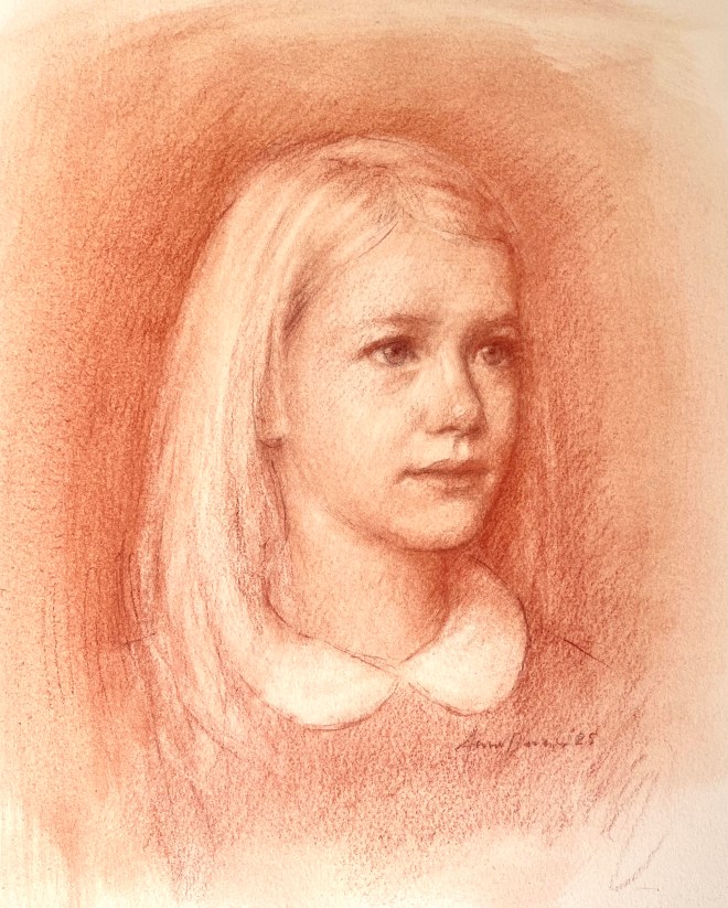 I love both sanguine portraits and charcoal portraits, I think there is something very expressive drawing a face in charcoal, maybe because of the simplicity of the black and white. Then there is the poetry of sanguine that creates a beautiful soft effect, with the loveliest earthy reds against the cream paper.