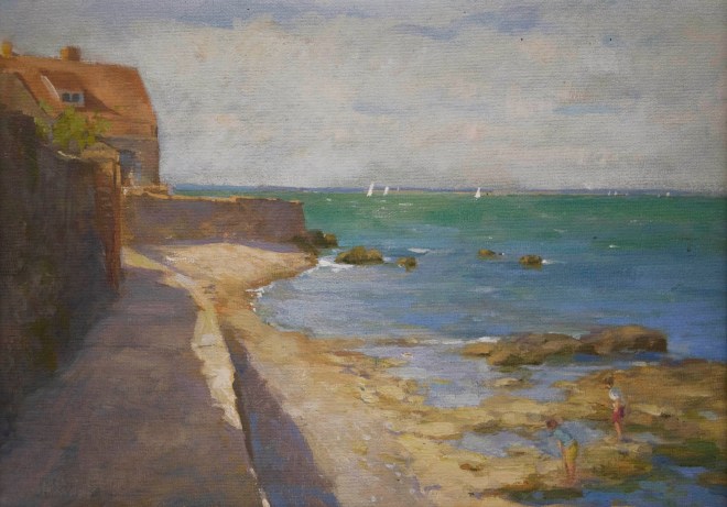 Lifting Fog, Ducie Beach. Isle of Wight. 50cm x 70cm. Oil on Panel.Path to the Beach, Bembridge. Study. 20cm x 30cm. OIl on Panel.House boats at low tide, Bembridge Harbour. 17cm x 23cm, oil on panel.The Needles from Alum Bay, Isle of Wight. 17cm x 23cm, oil on panel.Sailing around the Fort, Bembridge. 24cm x 35cm, oil on panel.Rocks, Overcast Day. Lerici. 25cm x 35cm, oil on panel.Low Tide, Porthnanven, Cornwall. 25cm x 35cm, oil on panel.