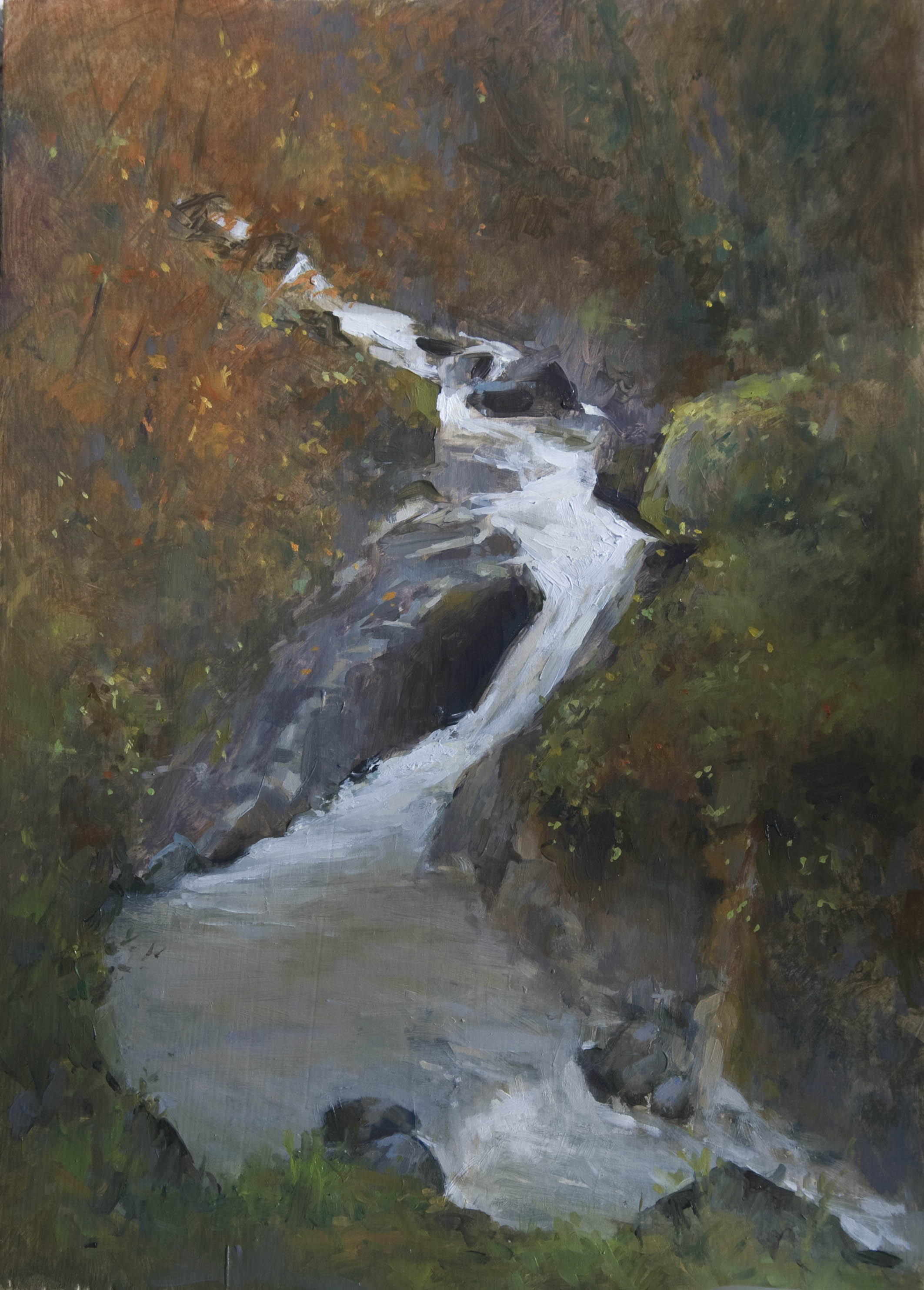 Normally I wouldn’t feel the need to explore the woods with my painting stuff close to the house but when there isn’t anywhere else to go you are kind of pushed by the force of adventure and just follow you feet. Woods play a big factor where I live. So after skidding down steep banks with the easel in one hand and tip toeing over slippery rocks with a palette of freshly squeezed paint in the other I found this spot on the river Mangia below our house, it’s a short flat stretch with a warm February midday sun reflecting on the water.