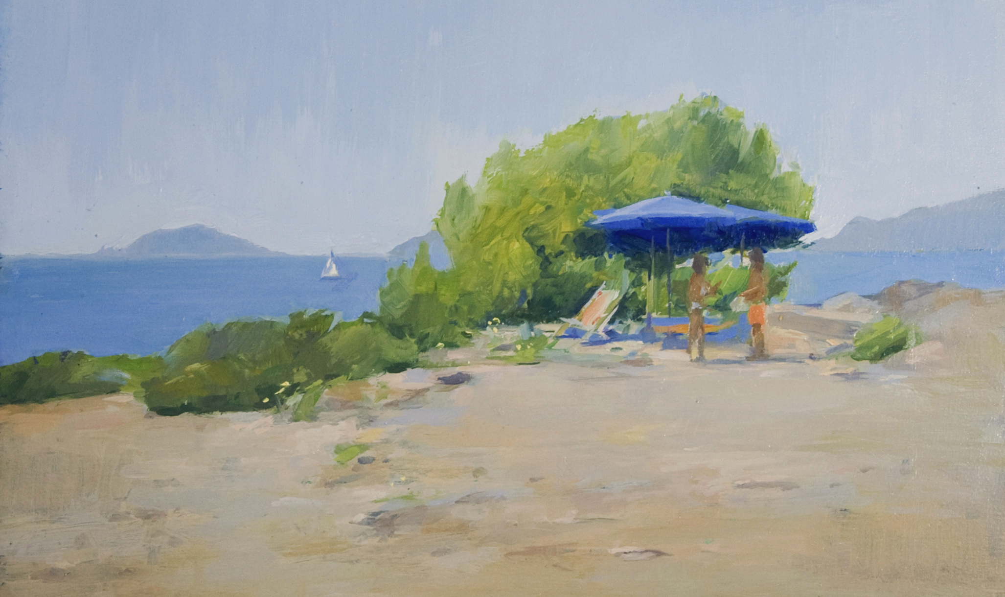 This painting was done in the shade under the pine trees (being English) at the beach in Liguria I often go to. I liked this little view with Porto Venere and the Palmaria in the distance (once you get past the couple having a loud discussion about how “Basta!! This place is rompendo i coglioni and we have to go away to another beach immediately because someone has taken our reserved sun lounger”! Finding shade is important when painting outside because working under the sun is hot and uncomfortable not to mention having sunlight on your canvas and pallet which will cause the values to be misjudged, i.e when you take your painting indoors you will find out you have painted everything too dark. If you have to paint in direct sunlight without an umbrella then you can mix your values lighter to compensate and if you have an umbrella dont attatch it to your easel on a windy day, you can imagine what would happen…it would be a case of a rompicoglioni moment!